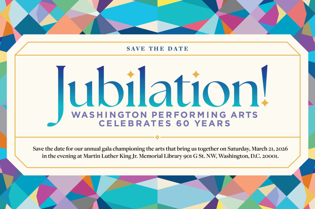 For more than 60 years, Washington Performing Arts has shaped the cultural life of our nation’s capital. As one of the first independent presenting organizations in the United States, we have paved the way for artistic innovation and cultural engagement. Our work has been recognized with the Presidential Medal of Arts, multiple Mayor’s Arts Awards, and national acclaim for our impact in performance, arts education, and community partnerships.